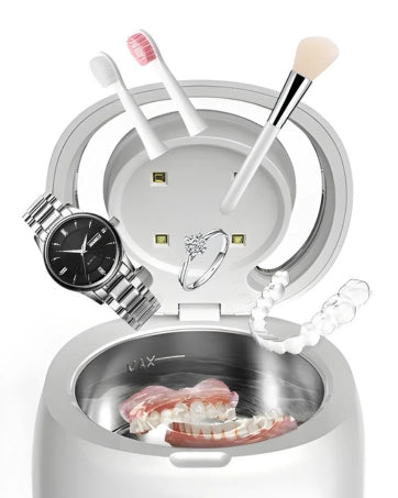 Suitable for retainers, dentures, aligners, mouth guards, jewellery, watches, and other small items, this device offers a simple and practical solution for daily cleaning at home or while travelling.