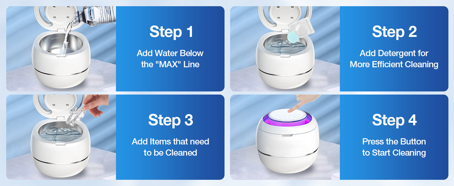 Fill the tank with water, place the item inside, and press the button to start the cleaning cycle.